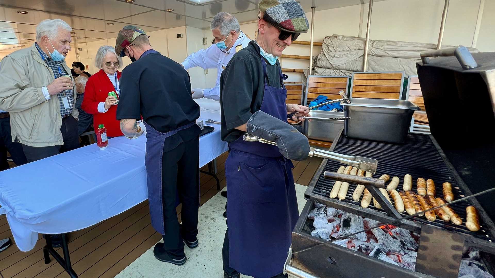 Photo caption and photographer: Head Chef Magnus, Sous Chef Mikael, and Hotel Manager Luis cooking and preparing hotdogs on the sun deck. Photo by Dennis Cornejo