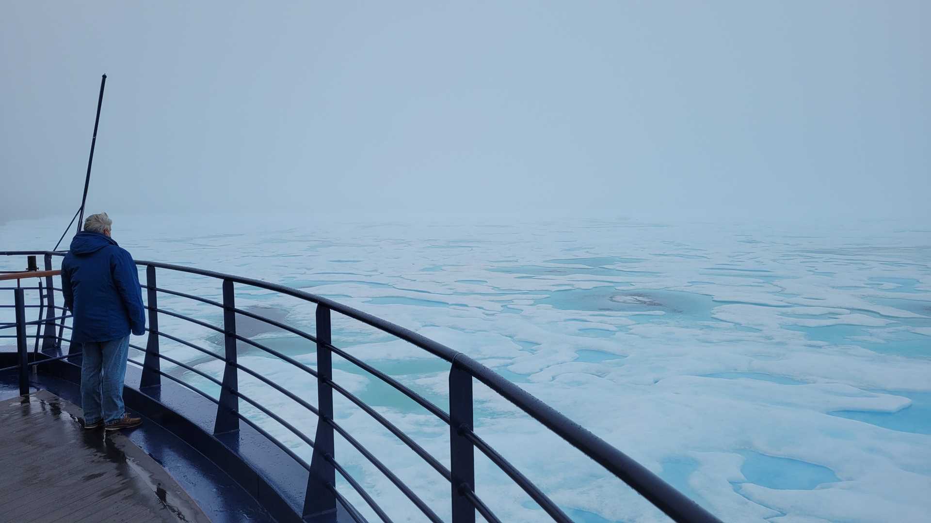 As we continue our west to east transit of the Northwest Passage, the day was spent searching for the edge of the sea ice, which by this time in the season has receded north some 60 nautical miles off the coast of Alaska. By using satellite imagery and ice forecast data, we were able to position ourselves alongside a large floe of sea ice just after breakfast. With eyes peeled and glued to binoculars and spotting scopes, the anticipation of finding a polar bear was palpable on the bridge and observation decks. By 0900, we had not seen any of the white denizens of the sea ice. A scheduled bit of administrative work had to be accomplished before we enter Canadian waters tomorrow morning, so we all gathered in the main lounge to fill out our Canadian Customs declaration forms. Just as that small task was concluding, a radio call from the bridge alerted us that indeed a polar bear had been spotted. The bridge team quickly brought National Geographic Endurance about, and in a relatively short time, the bridge was bustling with excitement as we all got our first looks at a lone bear making its way over the sea ice. Though the bear was in the distance and occasionally shrouded by a thick fog layer, we all got a wonderful opportunity to appreciate this magnificent creature in its natural habitat. We left the bear to its wanderings and made our way farther east.