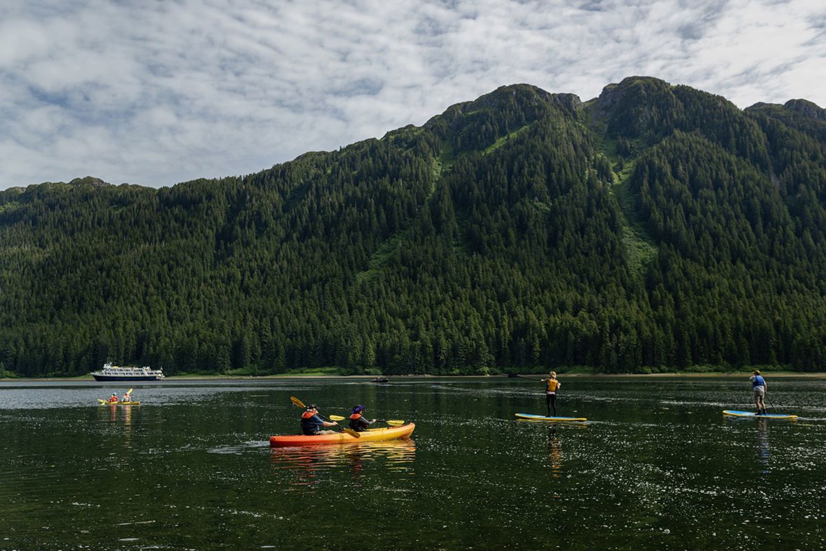The day began at anchor in Bailey Bay, a lovely secluded cove, with sunny skies and terrific reflections. During the morning, we participated in a variety of activities. Kayakers paddled around the ship and shorelines and were treated to the sight of a humpback whale lazily plying the waters. Expedition landing crafts zipped around on tours of the area, allowing those aboard to photograph the whale and some wildflowers. Hikers headed to shore, where they hit a trail that angled steeply into the forest. After passing a meadow, the hikers crossed a waterfall that plunged across the trail, and soon arrived at a stunning view. A lake fed by snowmelt rested under the mountains and a river poured off the cliffs, tumbling a few hundred feet to the bay below. After donating blood to the local insects, the hikers continued along the edge of the lake. They passed huge boulders with ice nestled in the shade, creating a natural air conditioner which was welcome on this "hot" day. Once back on the ship, our Global Explorer (age 11) joined the staff for a plankton tow, where she drove an expedition landing craft and gathered plankton for further inspection. Everyone had a chance to observe active zooplankton under the ship’s microscope.