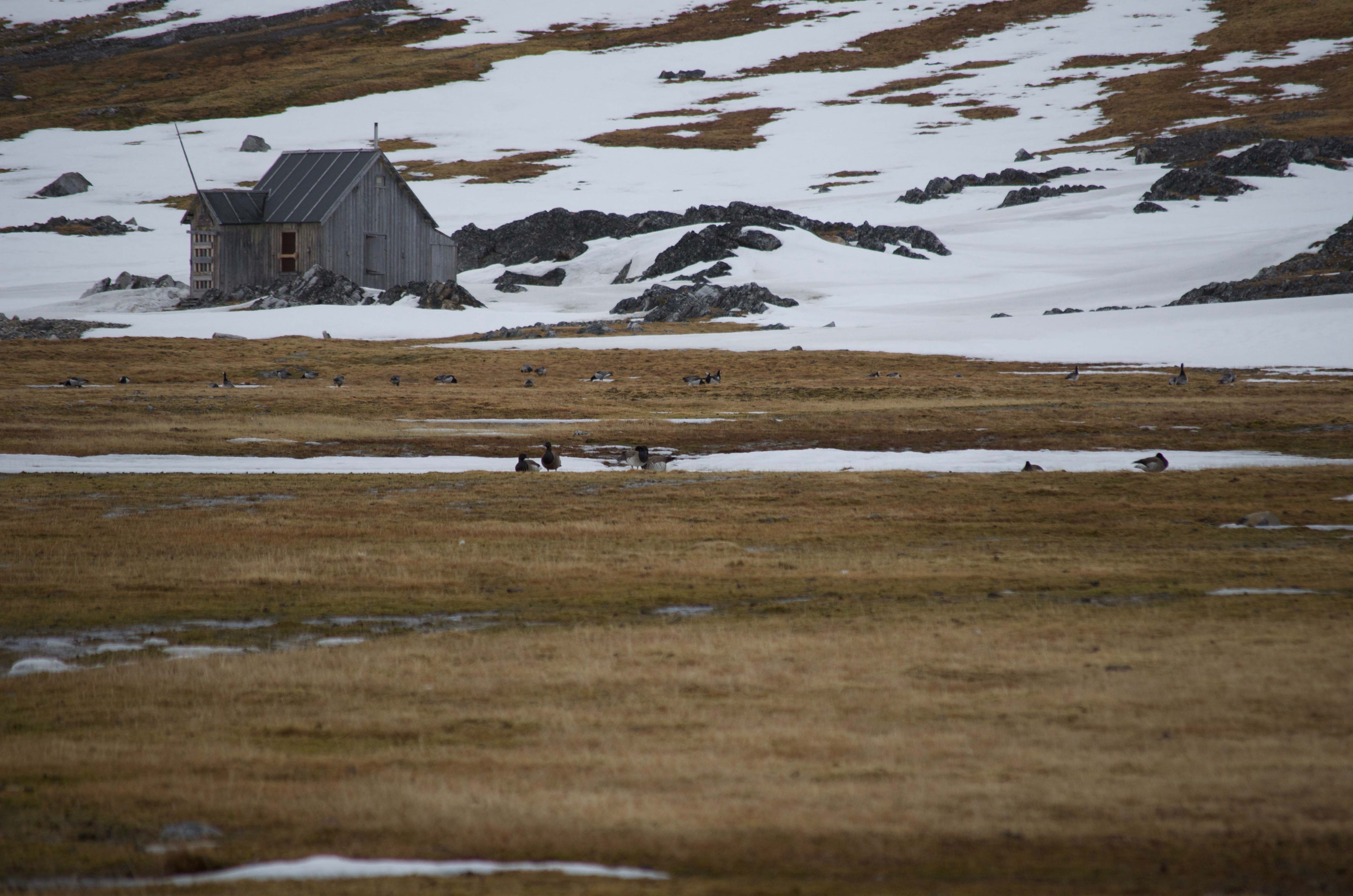To greet us just by the landing site, many Svalbard reindeer - the smallest of all species of reindeer and a key species for the tundra, were grazing on sparse vegetation. We walked from the beach, to snow, and the beginning of tundra that is starting to show up in between the melting ice. As we walk through this beautiful landscape the only singing bird in Svalbard, the snow buntings, sounds a beautiful melody.