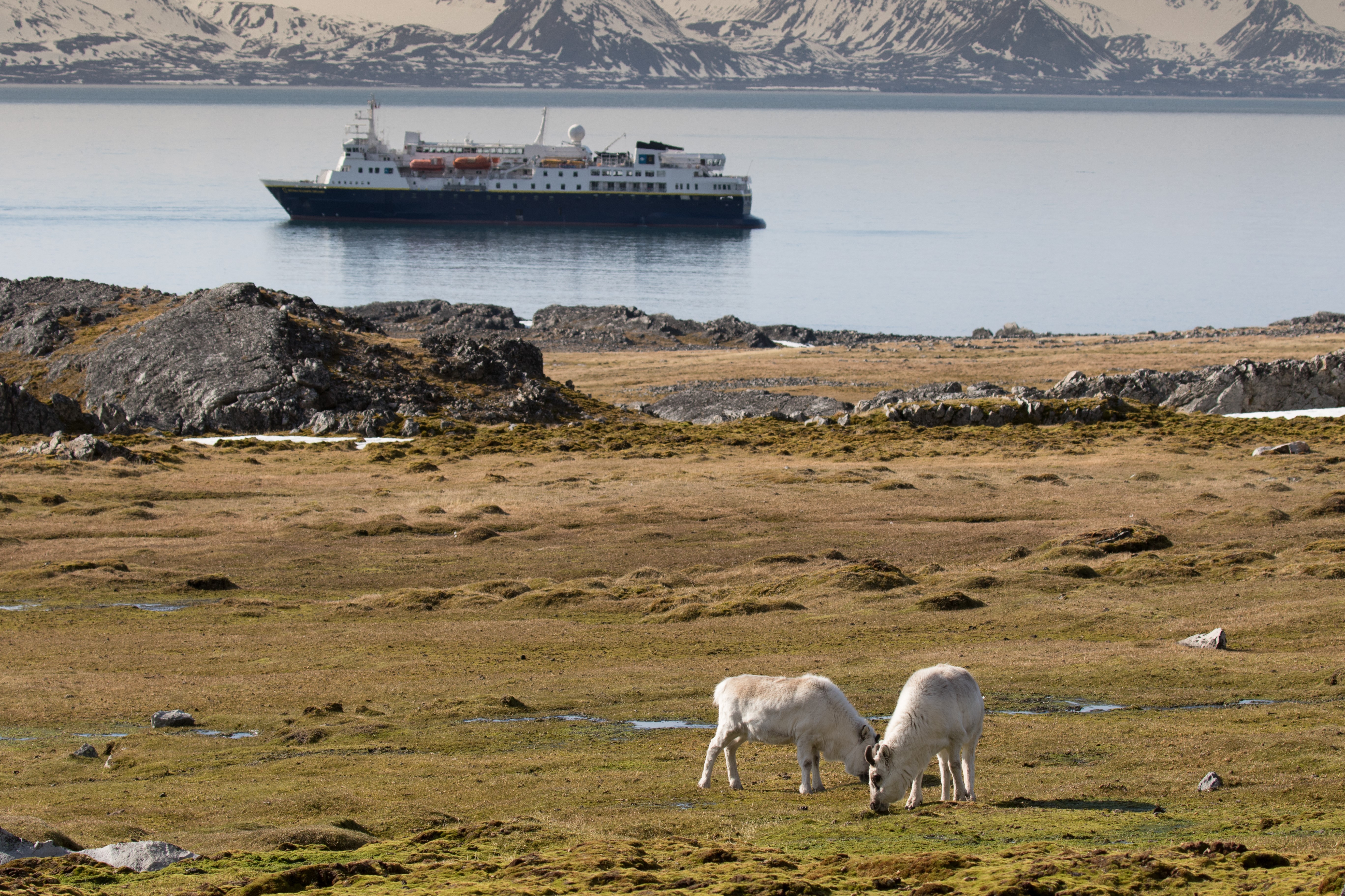 The coastline here is also home to Svalbard reindeer and polar bears. We saw plenty of the former but none of the latter. The ground was littered with the antlers shed by the reindeer over many, many years, if not generations. The reindeer still had their winter coats, so on this warm day, they were to be found lying down on the remaining patches of snow to cool down. Everyone was keeping their eyes glued to the scree slopes of the mountainsides in the hope of catching a glimpse of the very elusive Arctic fox. Alas, every panicked flight and cries of the dovekies merely alerted us to the presence of glaucous gulls or Arctic skuas (parasitic jaegers) rather than our quarry.