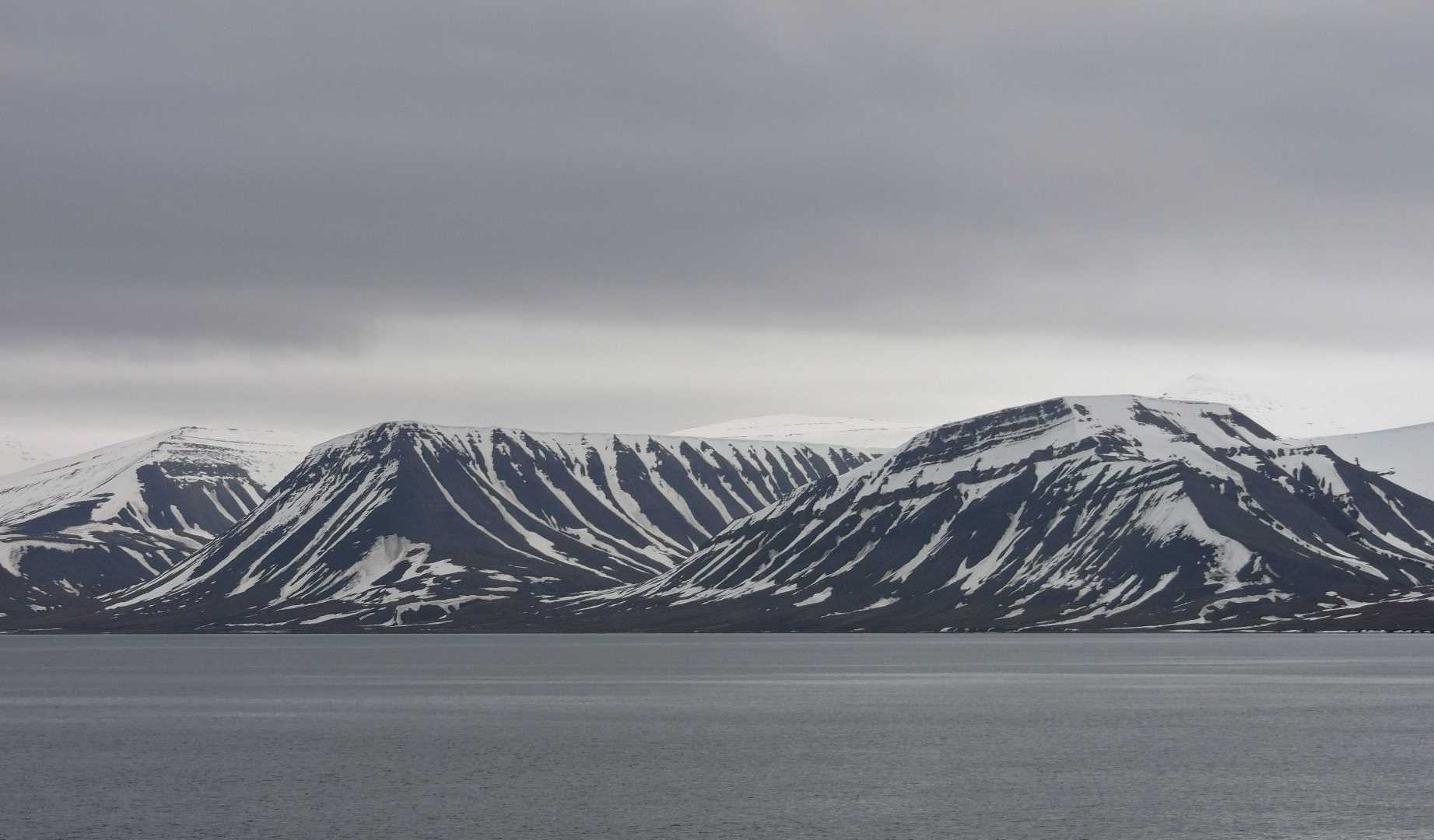 Early this morning, long before breakfast, the National Geographic Explorer sailed into the large, wide bay known as Bellsundet in southwest Spitsbergen. Deep inside, we squeezed through the narrows formed by the island of Akseløya and the mainland to enter Van Mijenfjorden. We sailed close to the now-abandoned coal mining site of Sveagruva, where we saw the community’s old buildings, towers, and storage tanks. The mine was established by Swedes in the early 20th century to extract high-quality anthracite and was later taken over by Norwegians who operated before closing in 2016. We discovered fast ice at the head of the fjord and spent time cruising along the ice edge in search of wildlife. The ice was fairly “rotten,” as we say, meaning it had melted considerably, with lots of open water pockets scattered throughout. This condition makes it easy for seals to haul out onto the ice and rest. In fact, we saw dozens of ringed seals spread out all over the ice. The surrounding mountains in this region are magnificent. Much of the landform was covered with snow, but in some places steep, eroded ravines and layers of ancient sandstones were visible, producing a photogenic herringbone pattern in the geology. On the surrounding, exposed, low hillsides, we could also see many reindeer.