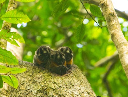 Night monkeys, sleeping in a hollow tree, peer down at us
