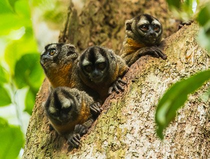 On a calm morning such as this, any motion in the trees can mean only one thing—monkeys. We stop to investigate and find both squirrel monkeys and saddleback tamarin leaping between branches. But the highlight of the morning is a great view of a family of secretive and rare night or owl monkeys sleeping in a hollow tree. As we nose the skiff under some overhanging branches and look straight up to see four pairs of eyes looking down on us. True to their name, these nocturnal monkeys have large owl-like eyes for hunting at night. As we watch them they are having trouble staying awake, and in fall back asleep by the time we pull away.