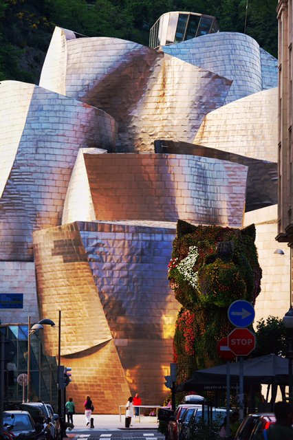 We walked around the Guggenheim Museum to admire the building. The sometimes cloudy, sometimes sunny sky provided curious changes of light to get interesting photos of the gleaming building. Then we went inside the Guggenheim to visit the art collection with works of art by Picasso, Braque, Miró, Calder, Rothko, Motherwell, and many others. Before getting on the bus again to go to the Old City, we took photos of the popular “Puppy”, Jeff Koons’ 43-feet-tall topiary terrier made of freshly potted pansies, which stands at the main door of the museum and is one of its symbols.