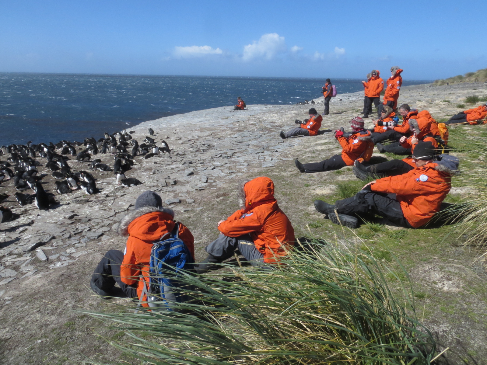 They say the Falklands are a windy place and after today, we believe them. Last night was a bumpy evening heading towards the Falkland Islands, and today we awoke to find National Geographic Onion anchored off the east coast of Bleaker Island. This low island provided only modest shelter from the screaming westerly winds that thrashed the island and had our Zodiac drivers showing off their deft skills, safely delivering us to a white sandy beach. Here we secured our hats and coats against the wind and headed out for a long hike across rolling farmland. Fluffy sheep and newborn lambs dotted the green paddocks and in many places we found upland geese hunkered down on their nests, keeping a low profile to avoid being blown away to the east. Two-banded plovers also nest here and in one instance a bird feigned a broken wing in an elaborate dance intended to lead us away from its nest. We quickly obliged. Further on, the hike reached the coastal cliffs where we found 850 pairs of rockhopper penguins sitting on their cliff-edge nests. The narrow fringe of tall tussock grass gave them some shelter from the wind and we caught glimpses of eggs tucked up underneath the incubating adults. Our morning finished, we boated back to the ship as increasing wind scoured sand off the beach. Our final destination – Stanley – awaits us this evening and tomorrow.