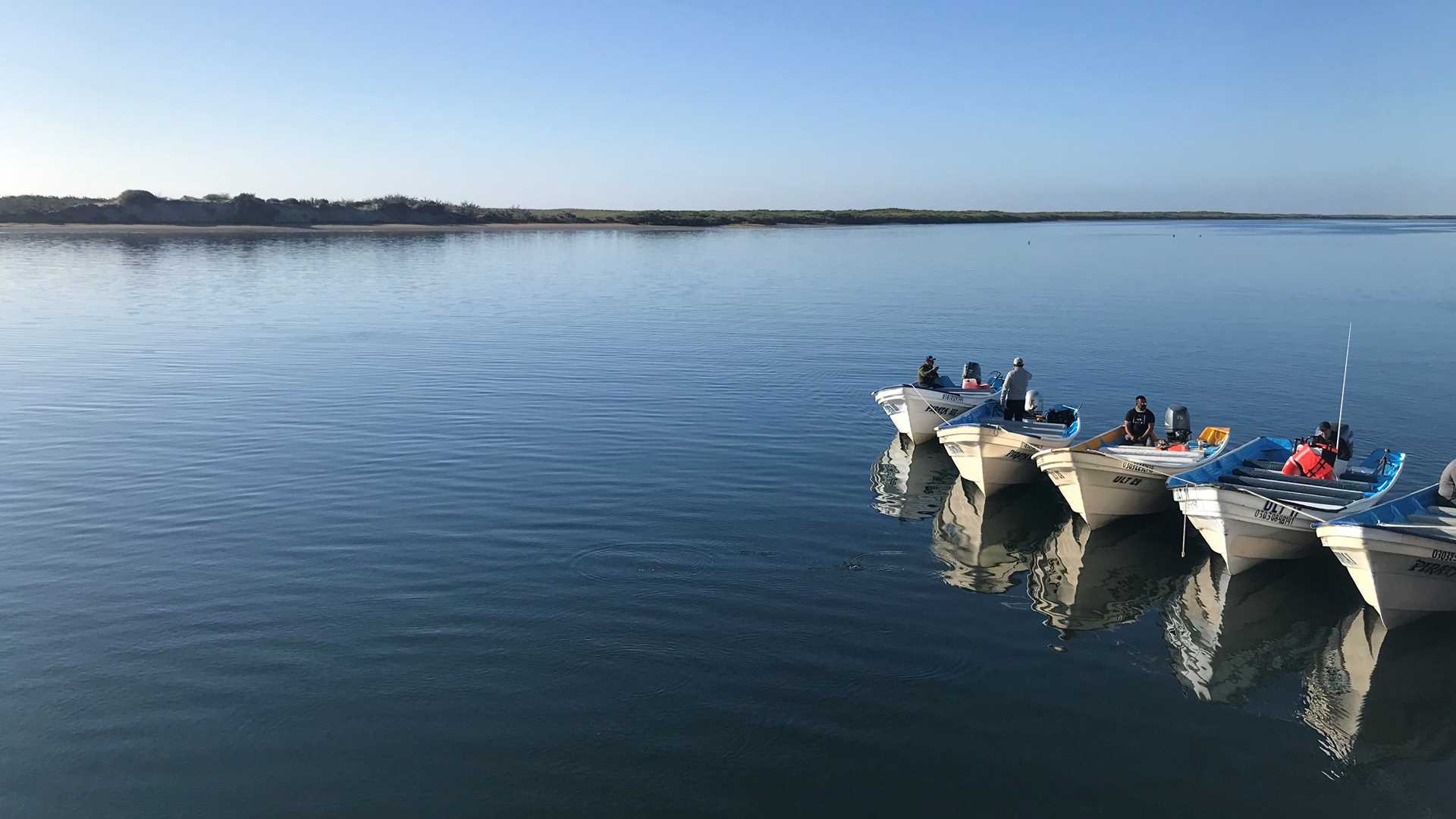 Photo caption: Pangas align National Geographic Sea Bird in the first calm water we have seen in a few days. These pangas are driven by local pangueros to whale-watch in the area. Photo by Kelly Ferron