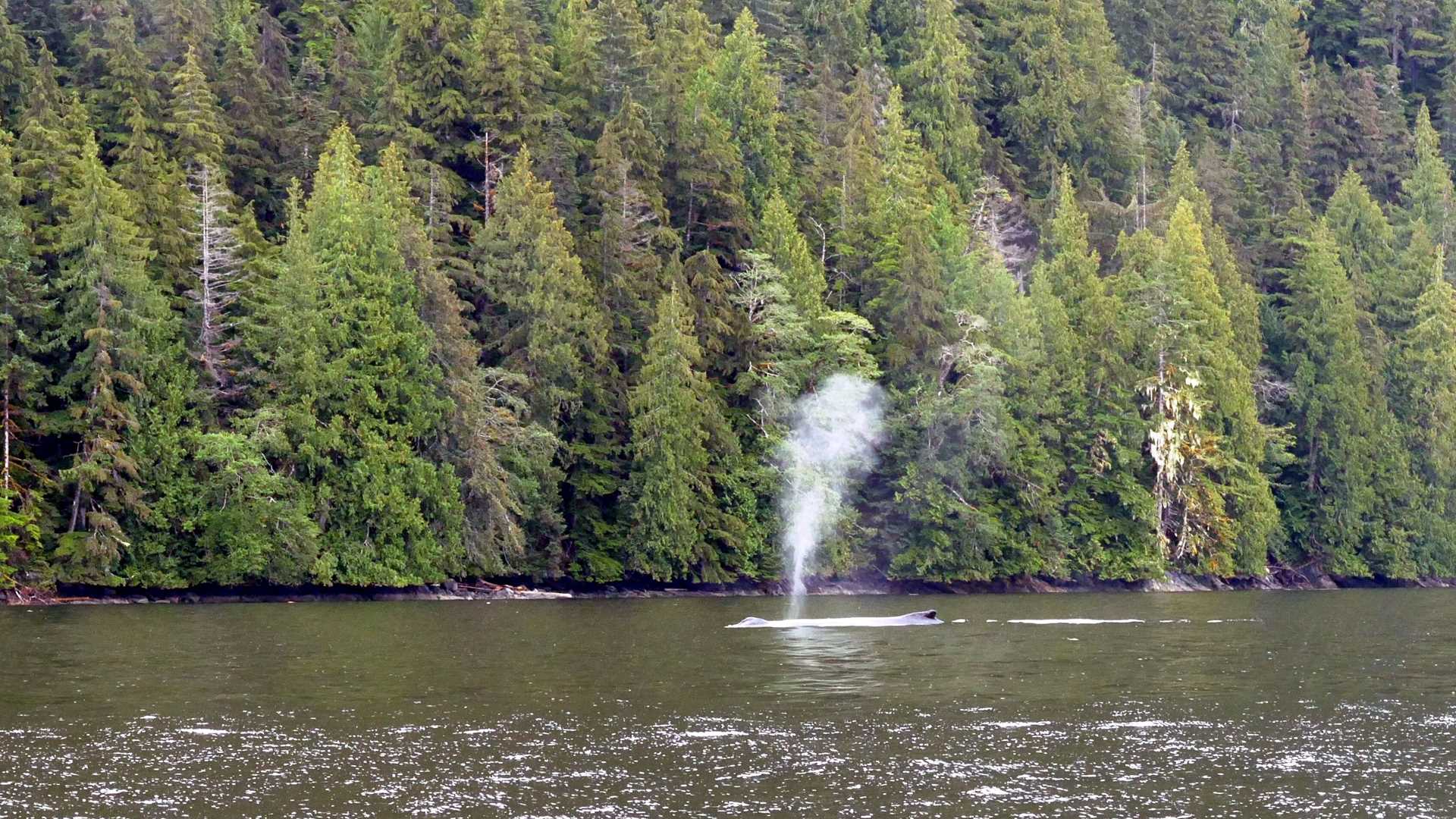Midmorning, we boarded our Zodiacs for a closer look at this remote area. Puffs of breath from numerous humpback whales floated above the western red cedar lined channel. White heads of bald eagles dotted the trees, and raucous calls of ravens entertained us while we marveled at the numerous waterfalls cascading down the steep faces of these fiord lands. Several groups of Zodiac cruisers witnessed the remarkable strategy of humpback whales bubble-net feeding. A whale blows a ring of underwater bubbles and flashes its pectoral flippers to concentrate a group of small schooling fish before it explodes at the surface with its gigantic, open mouth filled with tiny, terrified fish.
