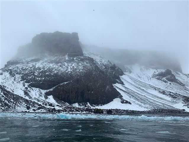 Today was the southern solstice—the longest day of the year in Antarctica. Suiting that longest day would be a full day of many varied activities. The morning started with a Zodiac cruise around Brown Bluff. Besides the wonderful views of the bluff itself, there is a large colony of Adélie penguins to see. Afterward, National Geographic Explorer set sail into the Weddell Sea in hopes of visiting and landing at, Devil Island. But along the way we realized our sister ship, National Geographic Orion was nearby, and we decided to swing by and say hello. The heavy ice conditions that the Weddell Sea is known for were kind to us and we were able to reach Devil Island. Upon landing, we went hiking and visited another Adélie penguin colony. Any normal day this would have been a full day, but in honor of the longest day, we decided that after dinner we would park Explorer in fast ice and enjoy some hiking on the ice.