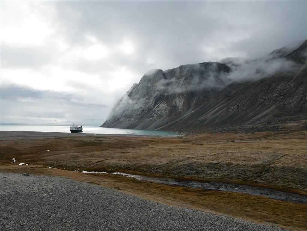 We began the day by entering Buchan Gulf, full of dramatic scenery. We immediately saw polar bears in the distance, and after scouting the area, we decided that the sow and her two cubs posed no risk to a shore landing. We were able to explore the area and found four early Inuit fall houses. After our shore visit, 18 guests and 6 naturalists braved the chilly waters for a polar plunge.