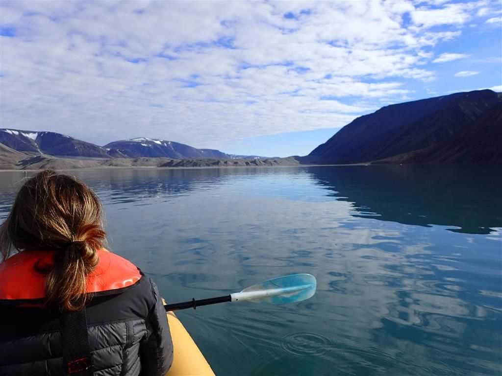 This morning, guests enjoyed polar kayaking and hiking in Feachem Bay off Buchan Gulf. The long hike became a short hike when a polar bear and her cubs were spotted along the route. Afterward, we visited the remains of a small Thule village protected by drifting sand. Former Canadian Coast Guard Captain Sylvain Bertrand, with his recently-trained archaeologist’s eye, located meat caches and a Thule tent ring on the site.
