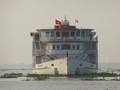 Today our Jahan anchored off Sa Dec, primly positioned for our exploration of Binh Thanh Island deep in the nine dragons of the Mekong delta, home of Vietnam’s rice bowl…and so much more! After a hearty breakfast, we were soon boarding local sampans, spacious, covered, local longboats—perfectly designed for relaxed exploring of the river’s intimate waterways, channels, and canals. We were swept along at the constantly engaging and lively water level, 360° views surrounding us—here a number of fish farms, there water hyacinth being grown and harvested—to be turned into everything from handbags to furniture, a couple net-fishing in a dugout canoe, a dog sleeping by a floating home—here a heavy boat bulging with sand, there someone off to market with a stack of watermelons—everywhere, something was happening. Such vibrant and eye-opening scenes.