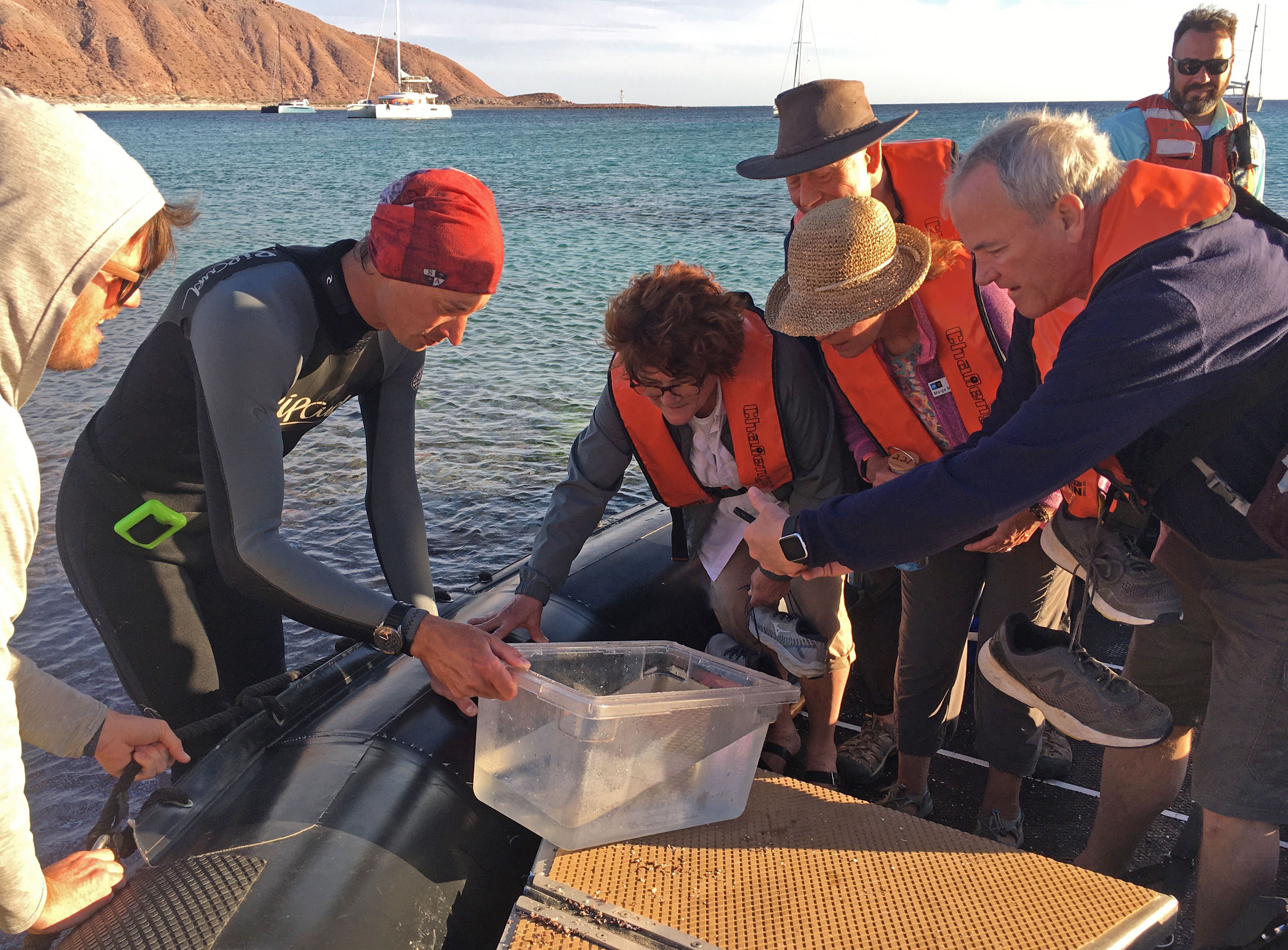 The climatic conditions at sea are unavoidable, and today we experienced strong winds from the north. The winds channeled through the entire Gulf of California. National Geographic Venture successfully anchored at beautiful Caleta San Juanico on the peninsula of Baja California, just a few miles north of Loreto and a few miles south of Bahia Concepcion. Well protected by the impressive volcanic cliffs of the La Giganta mountain range, the quieter conditions of the caleta allowed us to kayak and cruise on Zodiacs. The highlights of the morning were the complex and interesting geology, views of the traditional ‘tree of flags’ (a sweet mangrove tree with flags from visiting boats), osprey nests, blue-footed boobies and the magnificent landscape.