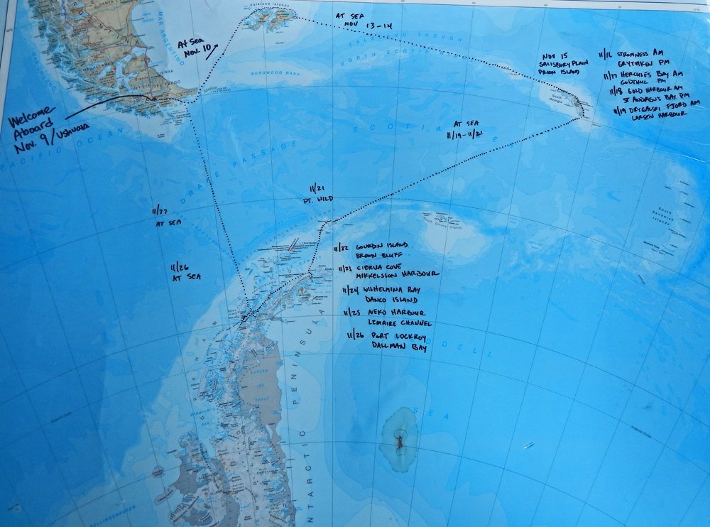 During the afternoon, once the ship was sheltered from the seas, the last presentations and preparations were being made for tomorrow’s departure. Packing, sorting, organizing, and other projects were underway. One of those projects was taking place at the expedition map of the ship’s travels throughout this three-week expedition to the Scotia Sea. The staff and many guests have been dutifully plotting our course each day as we first traveled to the Falkland Islands, then to South Georgia, and finally to the Antarctic Peninsula and back across the Drake Passage. The “full circle” as our captain called it. Maps and charts are an abstract memory device due to the huge scale reduced to a single flat representation of our travels, but they anchor us into a part of the world that we can all say we now know, and have visited with comfort, safety, and wonder. That could not be said for the explorers of a century ago, who did know the area but would not have described their travels with the words comfort and safety.