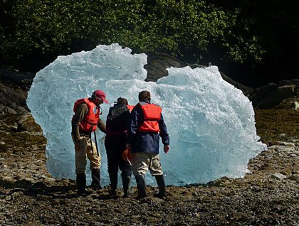 Above-average temperatures sweltered across Southeast Alaska today. Shorts, t-shirts and sunburns accompanied our ship from start to finish. Fantastic mist clung to the hillsides as we steamed into Scenery Cove; sunlight streamed from above the Coast Range and we had the rare good fortune to have perfectly blue skies. The Baird Glacier chilled us briefly during morning stretch class, but after breakfast temperatures steadily rose.