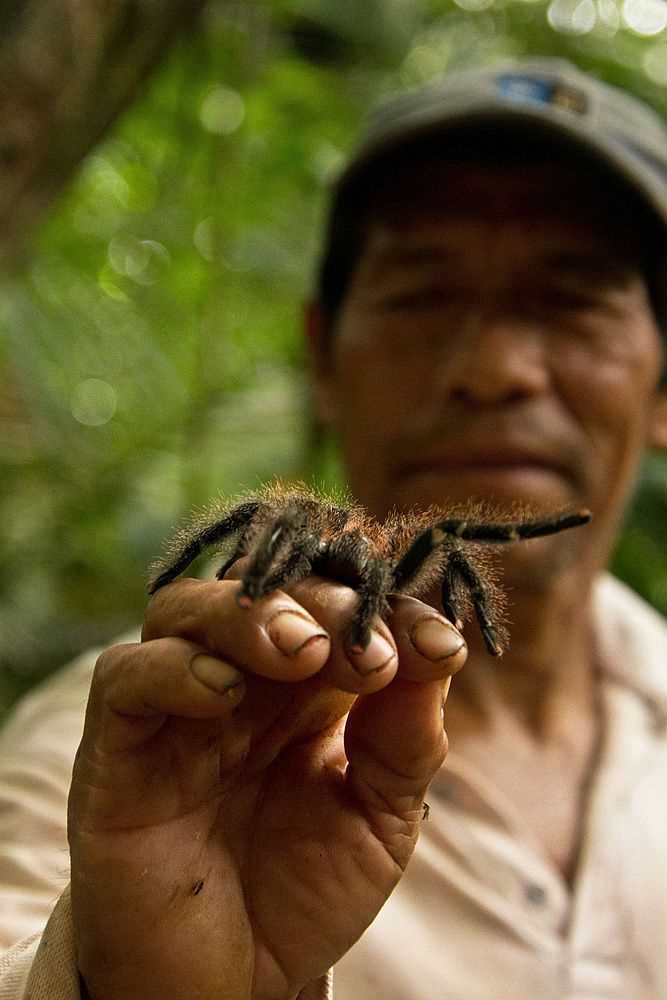 After breakfast, we headed to Casual to hike a trail maintained and protected by a local community. This outing was an introduction to neotropical rainforests. Led by our naturalists and escorted by three members of the community, we spotted some very well camouflaged wildlife including several frog species and a pink-toed tarantula. Thanks to our scouts, we located a green anaconda near a small stream by the side of the trail. Climbing a clump of vegetation, it slowly revealed the beautiful patterns of its nine-feet length, normally kept well-hidden as it hunts.