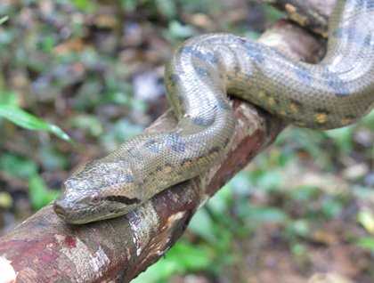 A highlight of the hike was the “finds” from our local scouts. We had three extra assistants along. These men, with their machetes in hand, went off the trails and came back to show us some of the more hidden inhabitants of the forest. A four-foot long anaconda was one of the first critters we got to admire and photograph. Then we saw a tarantula, a tree frog, leaf frogs, and eventually the bright colored poison dart frogs of red, black-and-blue, and blue-and-yellow—each of them smaller than the size of a thumbnail and brightly advertising their toxicity! A final surprise was the rainbow boa that was wrapped around the arm of our scout. It was not out for a meal, just hanging on.