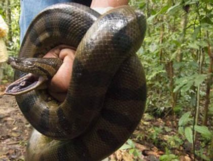 After breakfast, we walked in a beautiful section of terra firme rain forest, led by our team of naturalists and joined by some local villagers. Here, we not only learned about the many medicinal uses of rain forest plants, but we got to see an array of amazing critters. As we slowly walked along a nice trail, our local villagers would appear out of the jungle clutching something interesting. Poison dart frogs, tarantulas, lizards, and millipedes were exciting, but an anaconda was an incredible discovery. A “baby” at only seven feet long, it was wonderful to see this infamous snake.