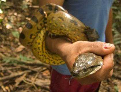 After breakfast we went for a walk in the forest at Casual. Here, our expert naturalists were joined by some local guides. As we made our way through the forest, they would disappear deep into the jungle, and return with some amazing creature. At least five types of frogs were encountered, including two different species of colorful poison dart frog. Multiple lizards, a bat, and even a tarantula were treats. Certainly, one of the highlights, was a gorgeous anaconda. One local guide found it in a stream and brought it to us to show us closely. Very, very cool!