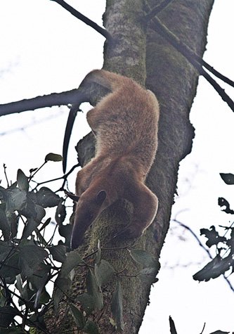 After observing and photographing the tamandua for a long time, we continued our ride even further into the creek, encountering our first three-toed sloth perched on the tip of a tall tree, among many other species and colorful birds, including the purple-throated cotinga!