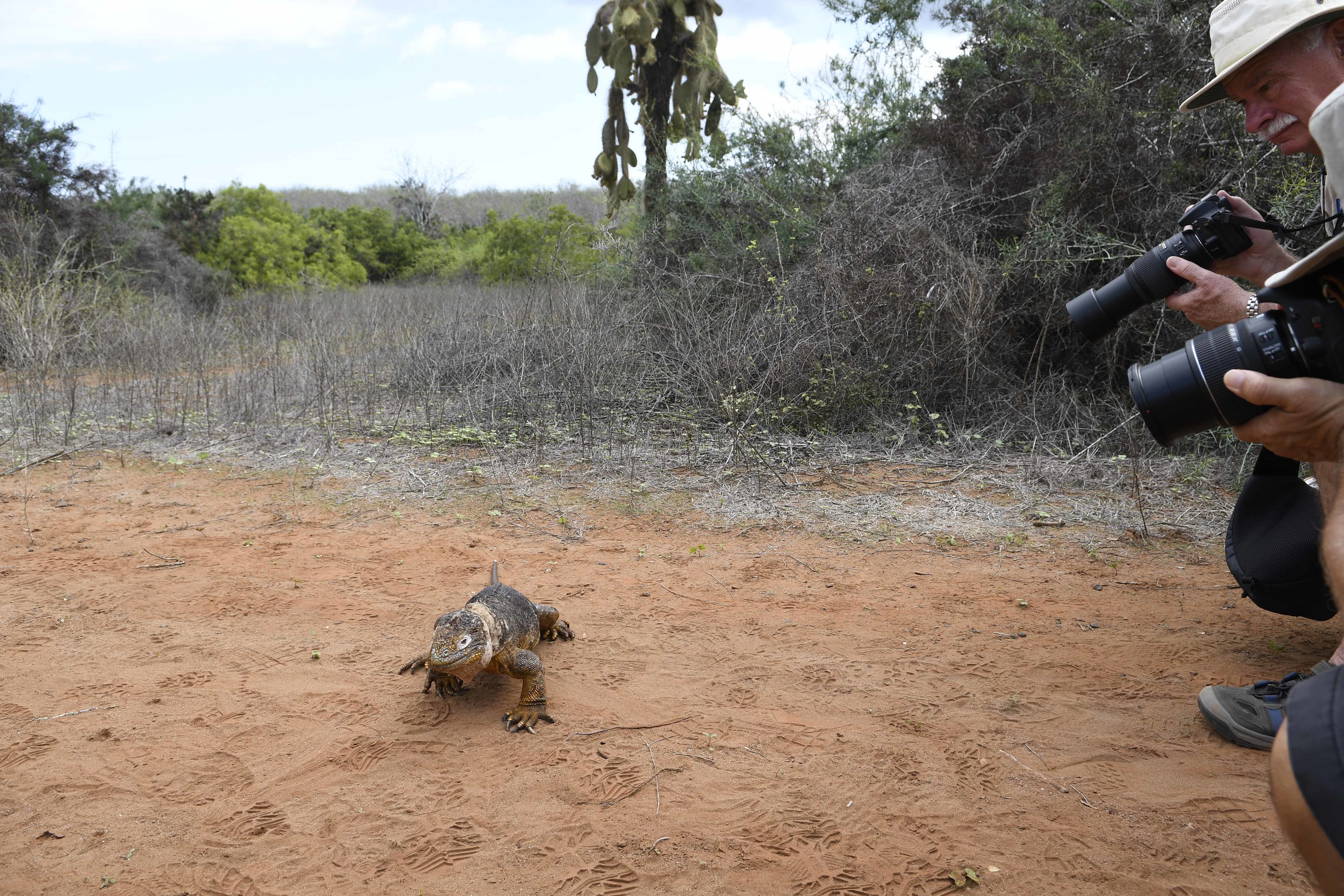 Today, National Geographic Endeavour II visited Cerro Dragon, located on the north part of Santa Cruz Island. We found one of the largest colonies of land iguanas. During our hike, we spotted the iguanas all around the trail. Some basked on the vegetation, and others were active. We saw the zigzag head movement they use to protect their territory and impress females. An Ecuadorian buffet lunch was set up in the dining room. We started with the traditional ceviche and ended with tres leches for dessert! We enjoyed snorkeling and Zodiac rides. We observed wildlife all over the place, including spotted eagle rays, sharks, blue-footed boobies, great blue herons, marine iguanas, and hundreds of other animals. They all reminded us why the Galapagos is so special.