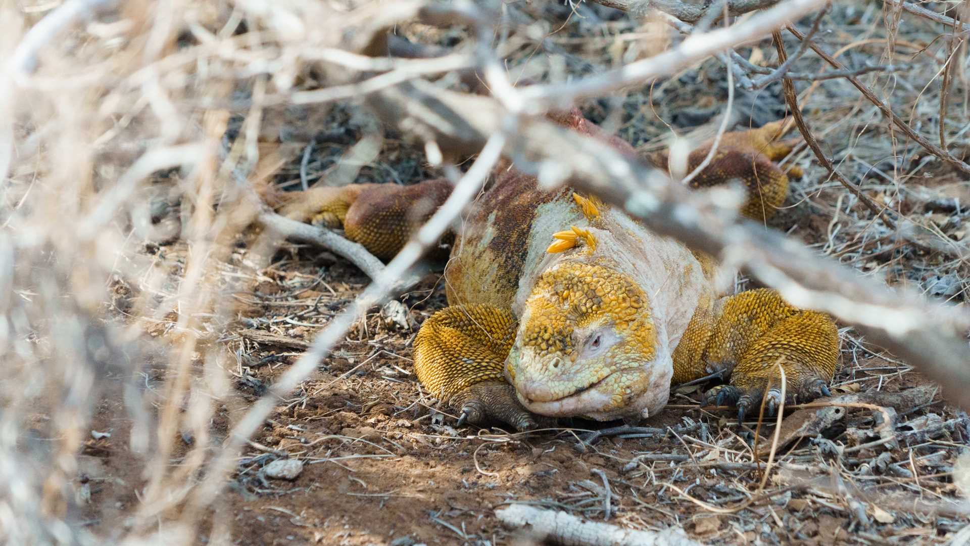 We followed the iguana trails and observed many iguana burrows. When we got to the top of the hill, we took in the great landscape. We found many Galapagos land iguanas on our walk, most of them in the distance. When we got to the last part of the loop trail, a big and very bright yellow land iguana was waiting for us to the side of the trail. We took many great photos.