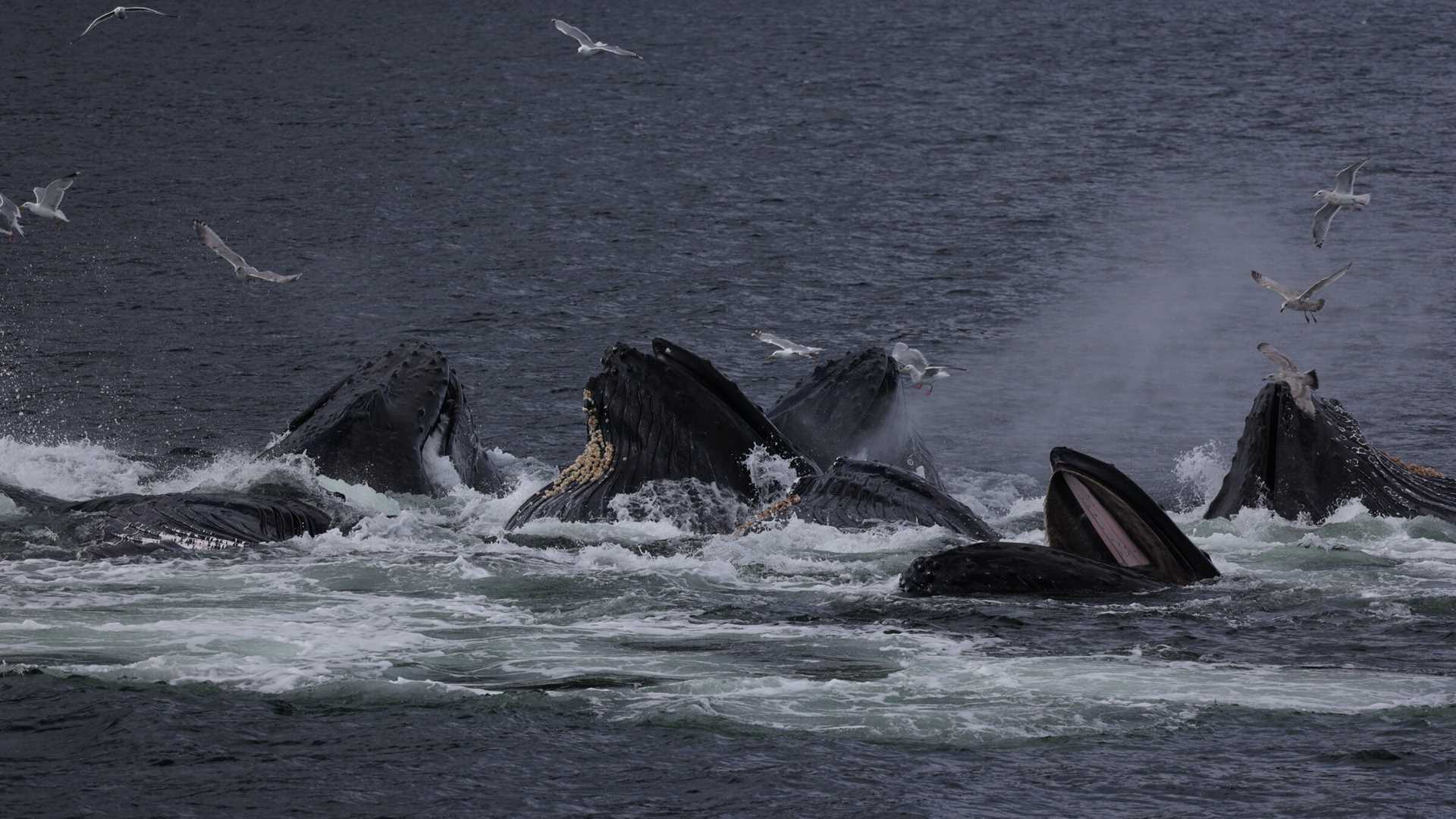 Those dining aboard had their lunch interrupted by those dining next to the ship: humpback whales engaged in cooperative bubble-net feeding were spotted off the bow. We approached slowly, and the whales returned the favor. They continued to inch their way toward our vessel until they were bubble-netting just a stone’s throw away. This was a total sensory experience: we heard the powerful exhalations, we saw the light scatter as a rainbow through the mist of the blow, and we smelled the salt waft through the air. Gulls spiraled above the pod, waiting for their own sensory cues to join in the feeding frenzy. The birds mesmerized us as they gyrated through the air and switched directions on a dime. Some guests waited with bated breath while others screamed with joy. All reactions, muted or audible, conveyed the awe only brought on by the natural world.