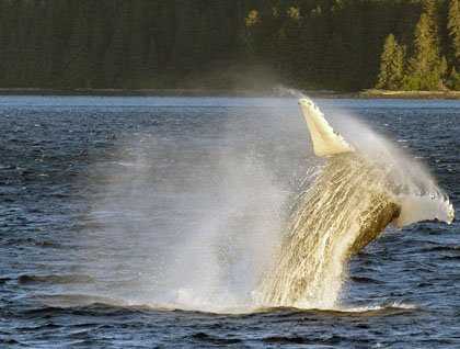 During the evening hours, the National Geographic Sea Lion made her way northwards and then west out through Frederick Sound and into Chatham Strait. Winds were predicted to be 20 to 25 knots. As the National Geographic Sea Lion entered Chatham Strait those winds hit hard as she made her way slowly towards our morning anchorage.  At some point in the night, our expedition leader was on the bridge and plans were changed to find shelter. As daylight crested, the bow of the ship was headed into Peril Strait, as we made our way towards Saook Bay.  Naturalists were on the bow with the sunrise when a breaching humpback whale was spotted!  At 6:30am a ship wide call went out and very soon the bow of the Sea Lion was filled with anxious whale watchers.  The whale continued to breach in the early morning magic light, providing a fabulous start to our day. Again and again we watched as this animal soared into the air displaying its long pectoral flippers, water falling away in the high winds. The ship was expertly maneuvered in wind and chop for wonderful views of breaching and finally tale lobbing as the whale began to slow down to just surfacing for long breaths of air. Long before breakfast, we were already enjoying sightings beyond belief!