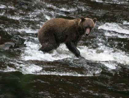 Some of us kayaked, and some of us walked into the forest, intending to reach the lake. The forest had bear trails meandering through it, and a wide variety of mushrooms added bits of color to the forest floor under spruce and hemlock trees. While we were there, a brown bear came out of the forest and walked onto the shallow part of the stream and began catching salmon. Viewing was outstanding! Whether we watched from the shore, up above in the forest, or from kayaks, it was simply thrilling to see the bear catch fish, and eat them. Later in the afternoon, two bears were feeding. We adjusted our hiking plans to take advantage of the great bear viewing. Today has been a fantastic beginning to our Alaska expedition.