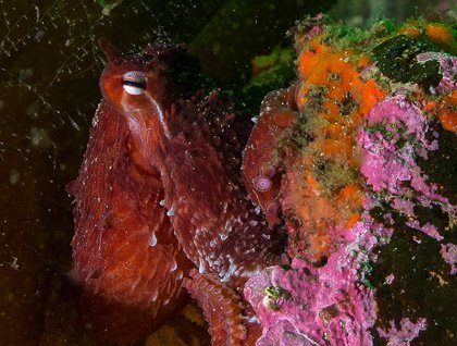 On the water, kayakers explored the stream up to its cascading waterfall, then branched out and paddled along the shoreline across the bay from our landing site. A slight wind and sprinkle accompanied earlier paddlers, but passed through to leave us once again with calm waters, and also a bit of blue sky poking through the shifting layers of high clouds. While we were exploring the waters above, our undersea specialist and purser went exploring below and brought us video and still photos. How surprising to see the rich and colorful marine world, including huge white plumose anemones, sailfin sculpin fish, and two—TWO!—giant Pacific octopus. Wow! One of these octopuses was in her home in a rocky crevice where she’s been seen many times, and on closer inspection a giant sac of eggs was illuminated. Apparently she will stay to protect her eggs until they hatch, not leaving even to eat, and consequently die of starvation at the end of the season. Seems sad to contemplate, though perhaps no sadder than any of our demise. The other octopus, smaller, was out in the open. This photo was taken from the video footage.