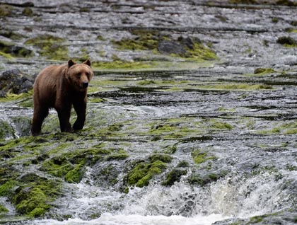 In the afternoon, we anchored at Pavlov Harbor on the east side of Chichagof Island in an area called Freshwater Bay. Guests had an opportunity to participate in both kayaking and nature walks. Just as the first round of activities began, a coastal brown bear perched on the small waterfall near the beginning of the hike and began fishing at the falls. These bears can eat up to 100,000 calories a day during the peak salmon runs, and we were lucky enough to witness the bear catch some massive, three-foot-long salmon. We watched as the bear continued to fish throughout the entire first round of activities, then reluctantly pulled away to meet up with our next round of activities. Fortunately, the bear remained at the falls, and those who went kayaking and hiking on the second round were also rewarded with fantastic views of the fishing bear.
