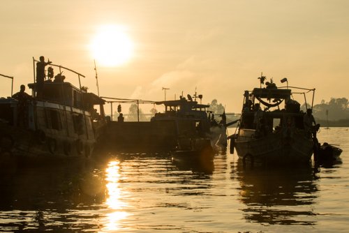 Our day began bright and early with coffee and croissants as the sun came up. We hopped into our local boats and puttered out to a very interesting floating market. Our local Vietnamese guides talked about how the market works as we watched small boats bobbing among the larger boats purchasing anything from pineapples to melons. We continued on to a fish farm, where we were welcomed onto the floating home/farm. Thousands of fish are held in a net pen below the house, while the owners live above with their dogs and fish food processers. Waving goodbye to our hosts we motored over to shore. The local town was packed full of people – people riding motorbikes at high velocity (some of them with live or gutted pigs dangling off the back), people haggling over produce and meat in the market, people clogging every square inch of the streets. The important holiday of Tet is coming up in a few days, and everyone here is scampering about in frenetic preparation. We joined the fray for a lively "trishaw" tour of town. A trishaw is a three-wheeled cart pulled behind a bicycle. We sat in the little carts and were wheeled about (occasionally at very high speeds through incredible traffic) by our cyclists, who whooped and hollered to one another and passersby. All in all it was a rather exciting experience. After joining the masses in tromping through the marketplace and investigating the local temple, we called it a morning and returned to the ship for breakfast – a meal which we felt was well earned by that time.