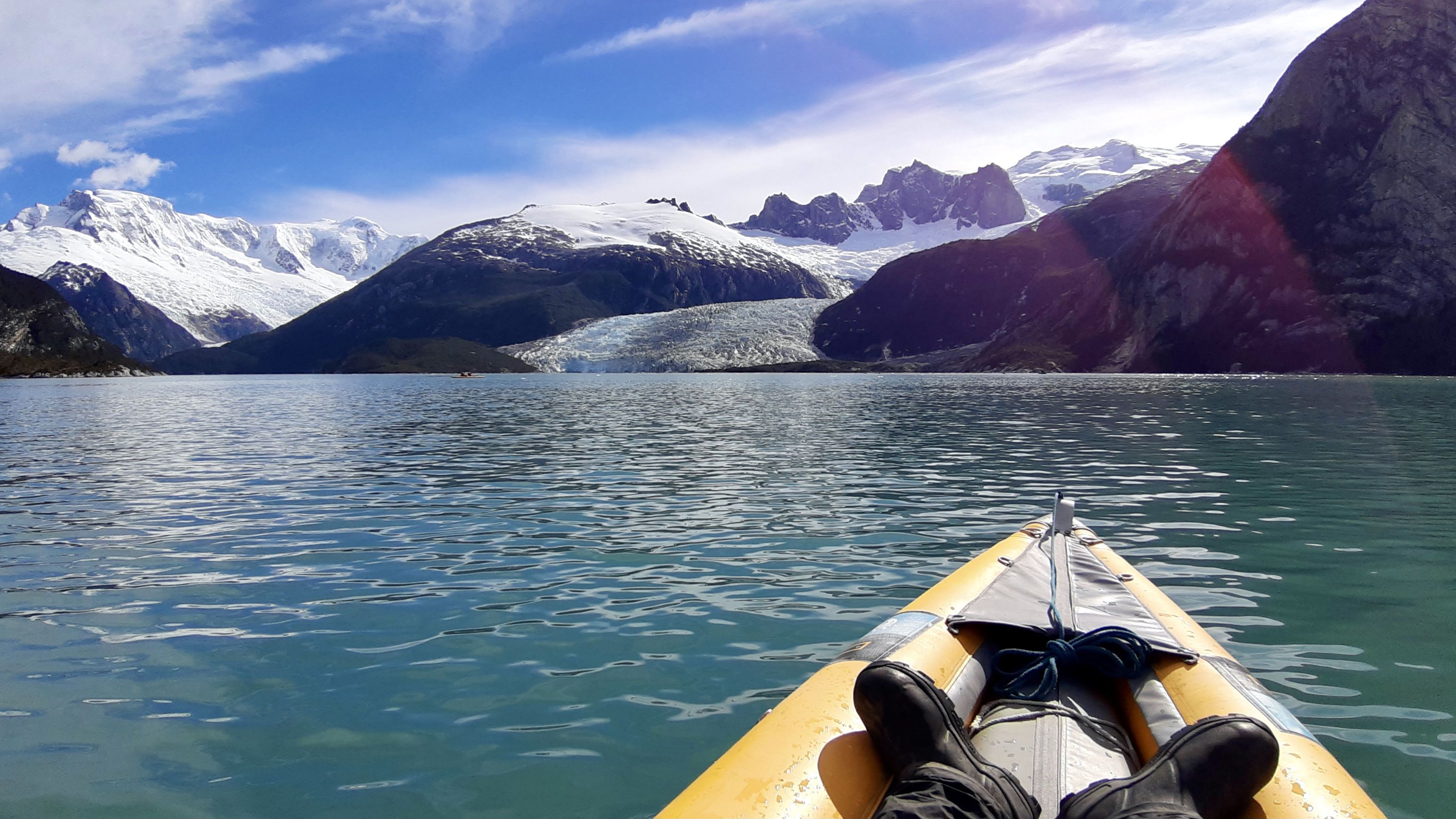 With majestic scenery surrounding us we explored the fjord in kayaks. Clear blue skies, dark green Nothofagus forests, and high waterfalls reflected on the glassy still glacial waters.