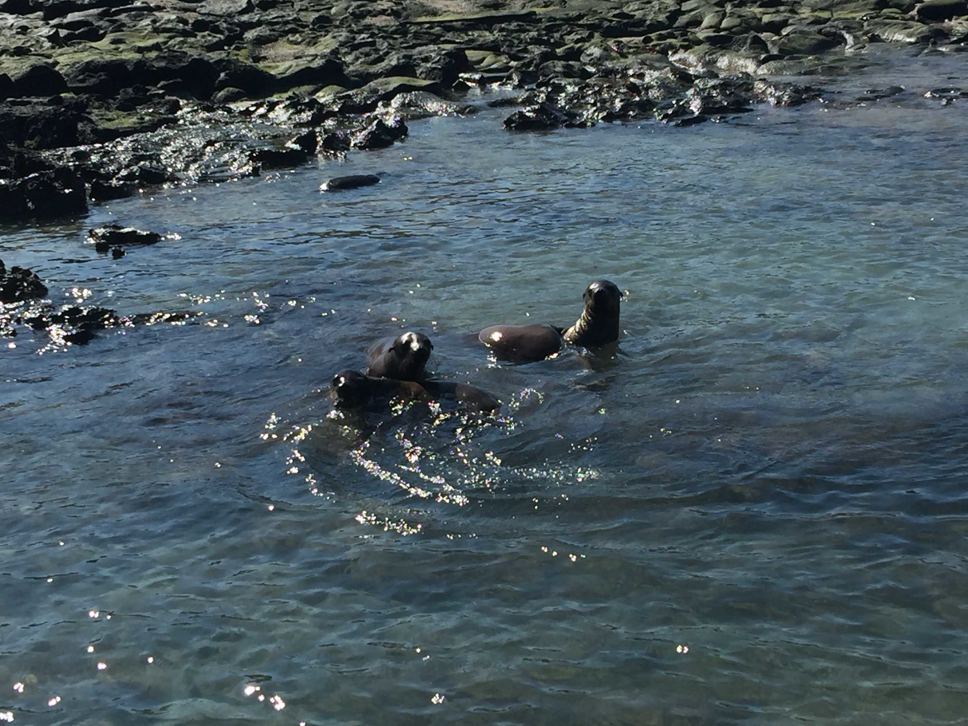 As the sun rose in the horizon, we found ourselves anchored between Chinese Hat and James Islands in a canal where we snorkeled, kayaked and rode Zodiacs along the shore. Some of our guests had the option of visiting a white sandy beach. Chinese Hat is an old shield volcano while Sullivan Bay is formed of new pahoehoe Lava.