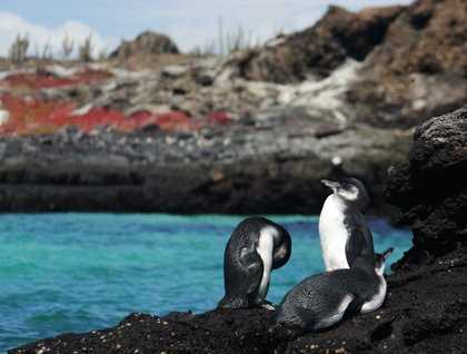 Some penguins eventually came out of the water and offered us a great opportunity to photograph them. The Galapagos Penguin is the third smallest penguin on the planet and the only one found on the northern hemisphere.  After the ride, some of us went on a small hike along the coastline of Chinese Hat, while others went snorkeling or just relaxed on a small white sandy beach. While snorkeling we spotted a large variety of fish, colorful marine invertebrates and were lucky enough to spot a couple of Galapagos penguins in the water. We were excited to spot the unique marine iguanas feeding underwater and grazing the algae off the rocks, a couple of white tip reef sharks were spotted and a large variety of fish were swimming in schools.