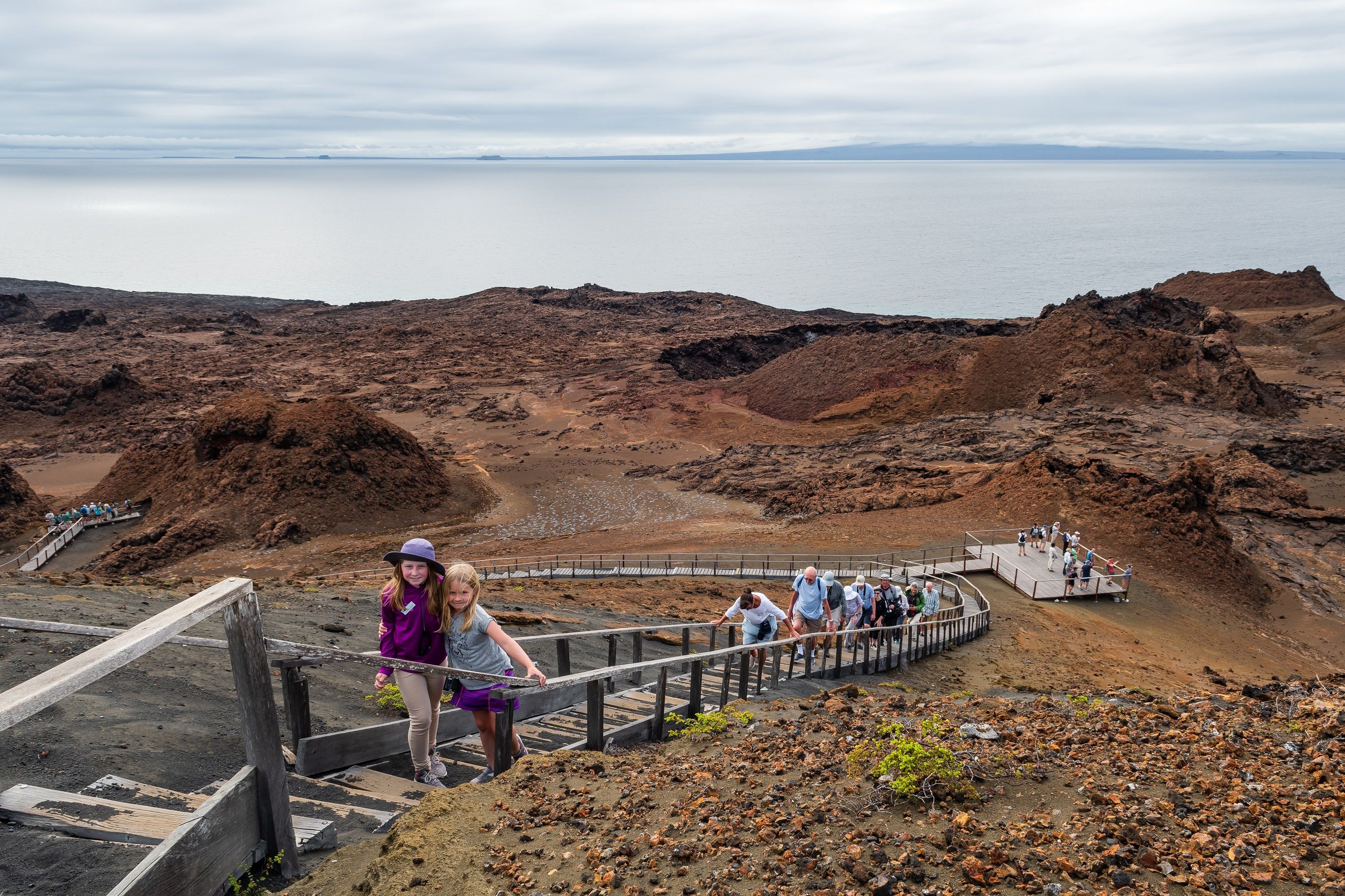 We woke up early in the morning as National Geographic Islander navigated along the northern part of Isabela Island. Slowly the sun appeared above the clouds surrounding Volcano Wolf. We spotted our first birds as Galapagos fur seals returned to shore from their night hunt. We enjoyed a great breakfast. Afterward, expedition leader Vanessa called everyone to the bow to celebrate as we crossed the equator. Our guests happily crossed the line. Approaching Punta Vicente Roca, the visitor site, we spotted Galapagos sea lions and a good number of ocean sunfish. The first activity of the day took place as we dropped anchor at Punta Vicente Roca. This is a spectacular geological site. The combination of the former volcano’s tall cliffs and the tuff cones formed later adds an amazing contrast to this unique visitor site. Our best tools for exploration, our Zodiacs, were lowered down, and off we went to explore the coast. We observed Nazca boobies and blue-footed boobies resting on the small ledges of the tuff cones. Galapagos sea lions swam close to our Zodiac, and Galapagos penguins rested on a broken piece of the tuff cone after feeding. What a wonderful sight! In a calm area, we found a good number of Pacific green sea turtles. The morning’s activities ended with snorkeling. Pacific green sea turtles, plenty of colorful fish, Galapagos marine iguanas and flightless cormorants surrounded us. It was a phenomenal experience! The ship was repositioned toward Fernandina Island. The youngest island of the archipelago, Fernandina is a highlight of our expedition. This island shows our guests the beginning of life. We observed animals thriving in the hostile environment. Pioneer plants like lava cacti grow on the lava fields, breaking down rocks little by little to create soil for the next generation of plants. Punta Espinoza is known for its huge colony of Galapagos marine iguanas. It is hard to distinguish the iguanas from rocks since they are so dark in color. On the other hand, colorful Sally Lightfoot crabs added contrast to the young, dark lava fields. We ended our walk as the sun was setting, returning to the ship with great memories. It was a fantastic day in the western part of the archipelago.