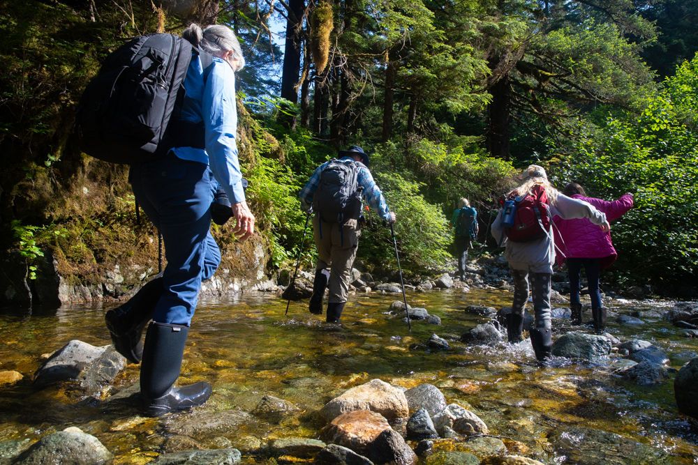 We woke to pretty clouds above the tree-covered hills as we sailed into Idaho Inlet, seeking wildlife. After breakfast, we landed at Fox Creek and hiked into a small waterfall along a salmon stream, through stately spruce and hemlock trees. The temperature was cool in the forest and black-capped chickadees sang to us as we walked along. Kayakers paddled in a beautiful cove with mirror-like waters, and other guests headed out on a cruise along the shoreline to search for wildlife and birds. It was a stunning morning. We sailed to the Inian Islands anchorage during lunch, and soon we were launching our expedition landing crafts to explore. The waters of the Inian Islands and Cross Sound are rich with nutrients due to the mix of upwelling currents and flooding tides, providing a wonderful food source for marine wildlife and seabirds. On this wonderful day, we saw Steller sea lions, sea otters, many humpback whales, and a minke whale. Late in the afternoon, we sailed over near Elfin Cove and went ashore to explore this picturesque and quaint fishing village on foot, making friends with the local dogs and talking with fisherman as we walked along the boardwalks of town.