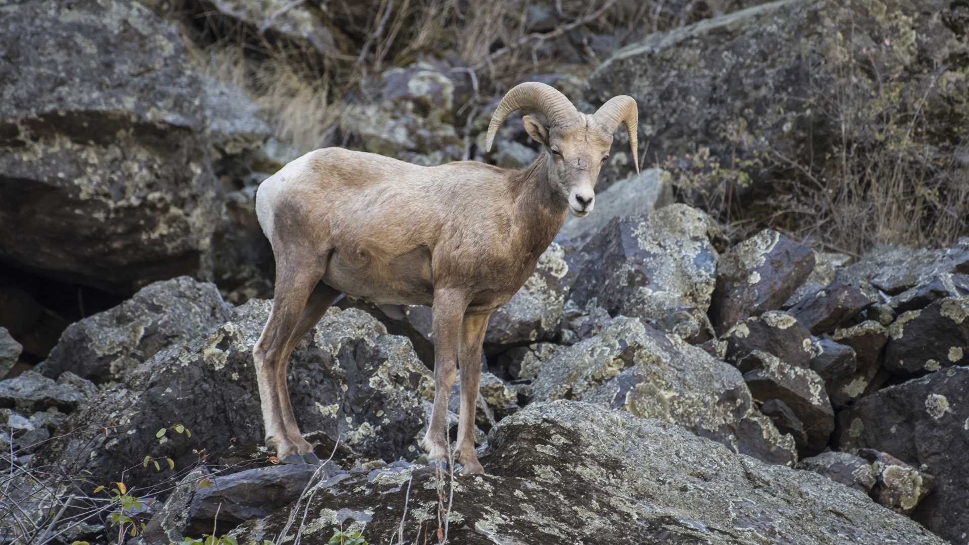 Two Rocky Mountain bighorn rams, magnificent with their great curved horns, make their way down through the rocks; we hope they will approach the river, but they are shy and mostly stay behind a low grass-covered rise. Later we see bighorn ewes and lambs feeding on willows along the river shore and have a very good look at them. The five-month-old lambs are cute and curious and come forward for a better look at us.