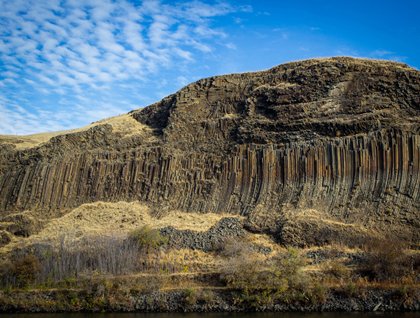 We woke to sunny skies as we anchored in Clarkston, Washington. The day would turn out to warm although the morning air was crisp and cool. Today, everyone loaded onto two jet boats to take an exciting journey up the Snake River into the amazing Hells Canyon. We saw great blue herons and western grebes along the shore as we sped away from the town. We eventually left behind the riverside cabins and ranches to enter the wild and deep canyon. Along the way we got a great look at Native American petroglyphs etched into basalt. Just as we were admiring the ancient artwork, we noticed a family of river otters playing in the water near our jet boat! What a joy to watch them wiggle and frolic.
