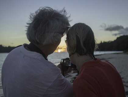 By the time we all returned to Anse St. Jose the sun was setting into blazing orange clouds and our fabulous hotel crew had set up a bar and a huge barbecue dinner for us on the beach. We ate and drank, watched the sun set and the stars appear, enjoyed a small bonfire and were treated to some song and dance by members of the crew that was by turns beautiful and very amusing. Our evening, and our long day, concluded with an exploration of the universe, from the nearest stars to distant galaxies, led by Tom who guided us with his amazing laser pointer. At the back of the beach behind us, beautifully sculpted boulders of Gondwana granite slowly faded into the dark of the tropical night.