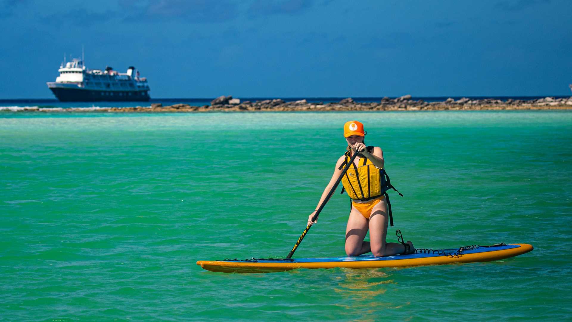 Strong winds and choppy seas did not dampen the spirit of adventure for National Geographic Sea Lion guests as they ventured off to explore Compass Cay. The morning activities included hikes, interpretive walks, a Zodiac cruise, and a short kayak paddle in Bonefish Creek, a tidal creek that runs between the outer ridges of Compass Cay. The trail along the windward rocky shoreline ends at Rachel’s Bubble Bath, an inviting tidal pool that fills when waves crash onshore and spill over the rocks into the pool. A refreshing reward for our hikers on the long hike. On our hikes, we observed charismatic and photogenic northern curly-tailed lizards as well as Cerion snails attached to dry palm fronds and tree trunks. Silver thatch palms dominate the higher elevations, while the intertidal zone located at the interior of the island is home to red and black mangroves. We also observed many birds, including palm warblers, Bahama mockingbirds, bananaquits, green herons, ruddy turnstones, and ospreys. After another wonderful lunch, guests returned to Compass Cay by Zodiac across the many hues of blue Bahamian water, the clearest waters in the world. Snorkeling explorations led us along the limestone wall. Scattered rocks of various sizes, once part of the rock wall, have transformed over the years into beautiful miniature coral reefs. These reefs are home to a variety of juvenile fish, the tiny jewels of the reefs. Juvenile yellowtail damselfish, queen angelfish, and rock beauties were just a few of those spotted. We also observed green turtles resting on the seafloor. The stars of the day and the main attraction were the nurse sharks. Many years ago, Compass Cay was more of a rest stop and a place for fishing guides to clean their catch and buy refreshments. Nurse sharks in the area quickly learned they could find a sure meal. Since then, the owner made Compass Cay Marina a no fishing zone. As a result, numerous species of fish are seen. We enjoyed observing bonefish, bar jacks, blue runners, and nurse sharks, among others, as we snorkeled. Back on the ship, our tired and happy voyagers enjoyed cocktails and delicacies from the galley while learning a more about today’s activities. As the sun sets once again over the beautiful Bahamian waters, we eagerly await the start of a new day of adventure tomorrow.