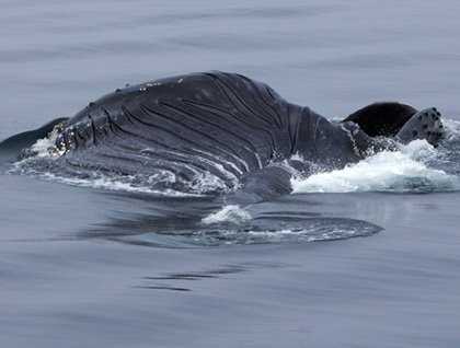 Our morning wildlife festival was not over though… a mother humpback whale and calf were feeding very close to the ship! A photographer-frenzy of clicking cameras ensued as we aimed our lenses towards these wonderful creatures. Fish tried in vain to escape throat pleats expanding and then closing of baleen plates as the mother humpback blew bubble nets and lunged upward to gather her meal. The calf also entertained us by rolling and slapping its pectoral flippers and tail lobbing.