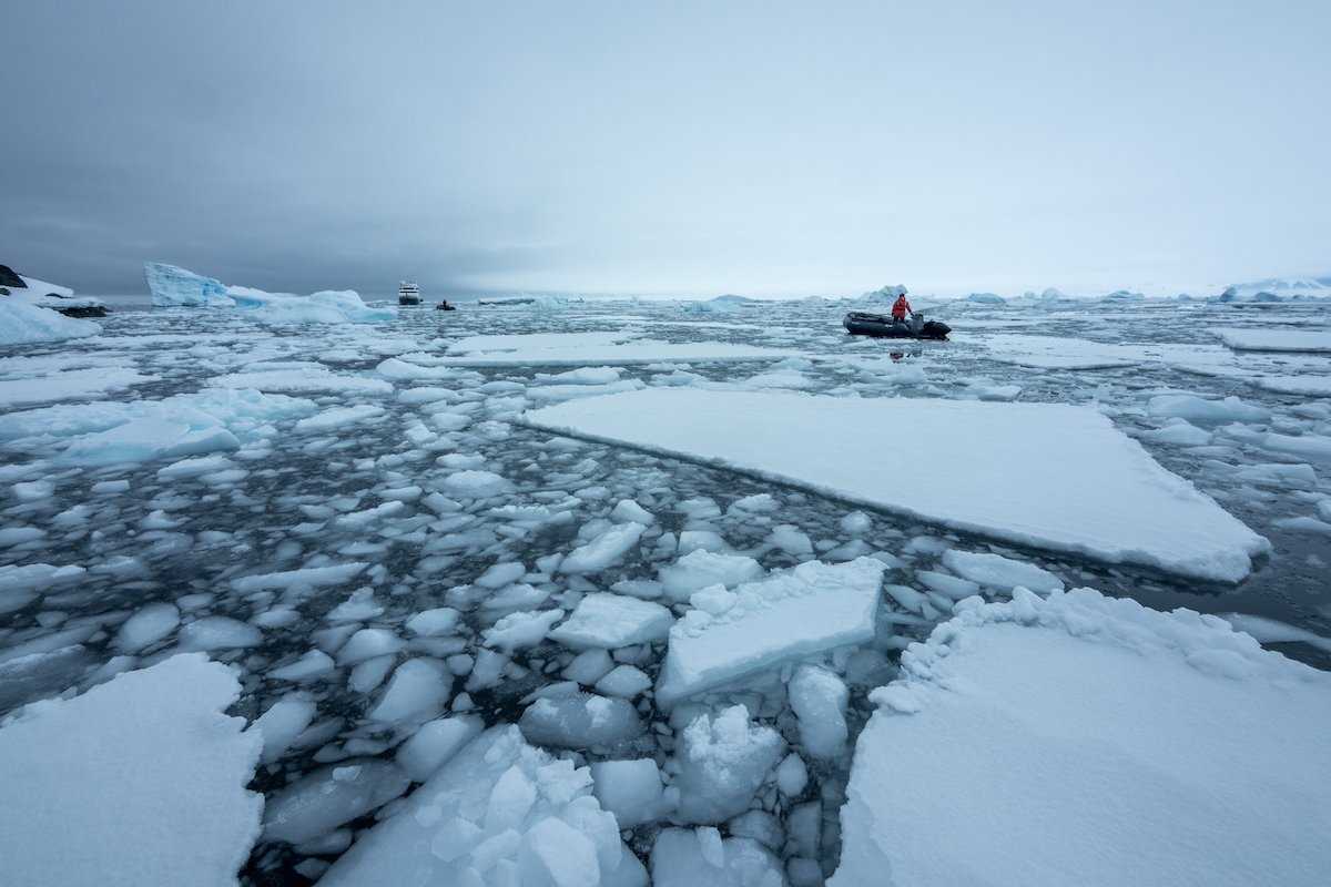 After, possibly, one of the most spectacular days imaginable, National Geographic Orion sailed north during the night. Navigating around Adelaide Island and into Crystal Sound, we made our way to our morning destination and final stop below the Antarctic Circle. Waking up to the sounds of growlers crunching past the hull, countless crabeater seals darted around their ice floes and the glass calm waters stretched out to where the horizon disappeared into the grey sky.