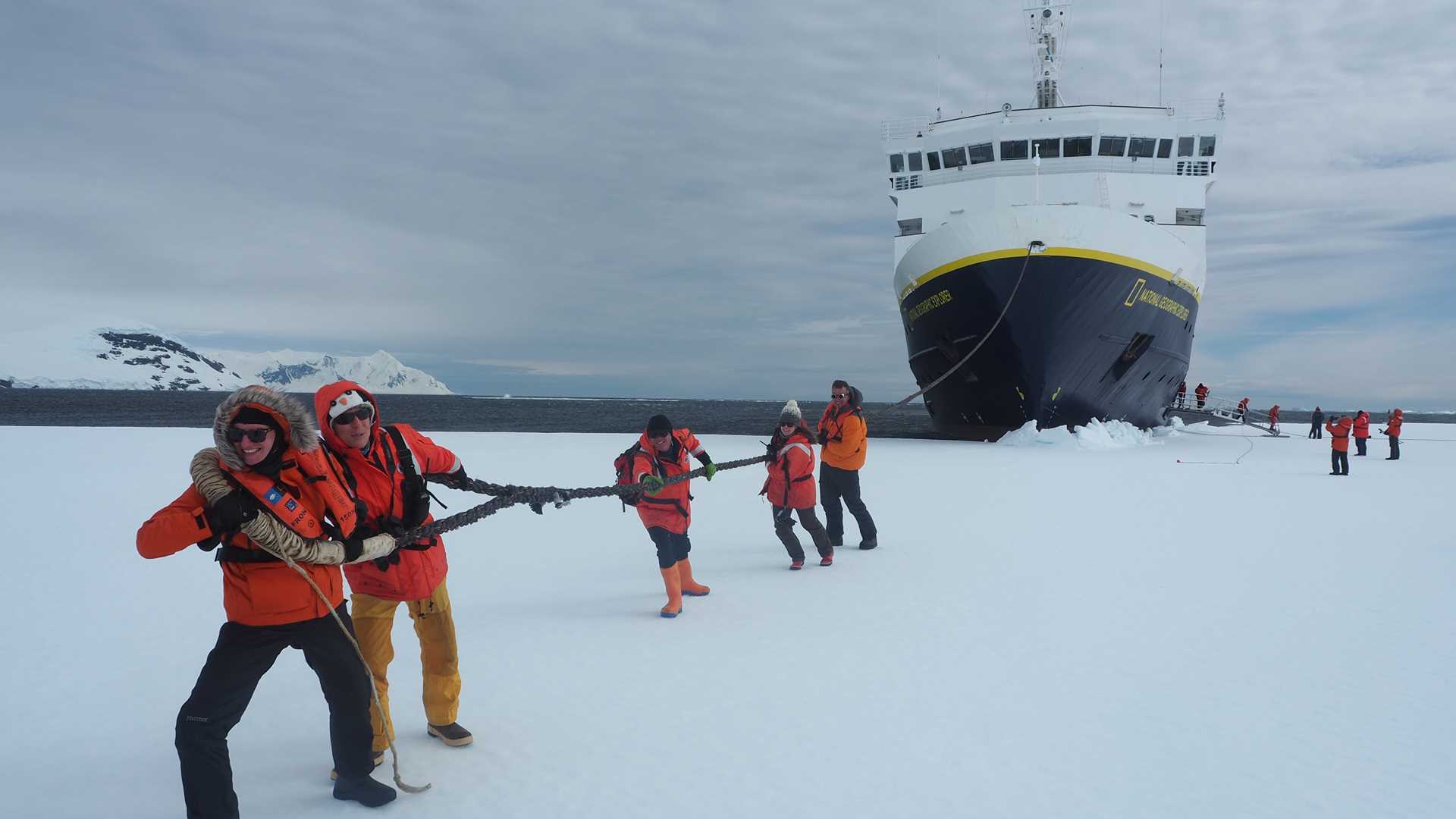 The endless, blinding-white ice was interrupted only by the odd Adélie penguin or crabeater seal. However, soon the ice was overrun by figures in orange, as the guests in their expedition parkas explored, getting close-up shots of the seals, or posing with a rope at the bow of the ship, as if dragging it through the ice by hand.
