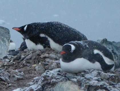 Our day aboard the National Geographic Explorer at Cuverville Island began at the northern end of Errara Channel. A low ceiling hung over the channel, and its calm waters enticed many guests into kayaks for the first time on the voyage. As the paddlers cruised among the floating blue ice, they witnessed a glacier calve multiple times, each with a thunderous boom as new icebergs were formed. The island also offered opportunities to observe several small gentoo penguin colonies, one of which was perched high up on a bluff. We watched patiently as several brown skuas sat lazily among the uneasy penguins, waiting for the chance to steal an egg. But the penguins prevailed and eventually the skuas flew off, without a meal, to harass the other colonies.