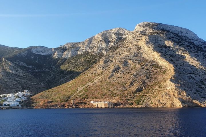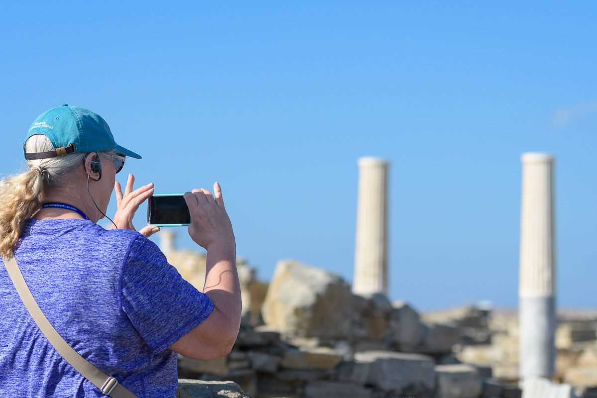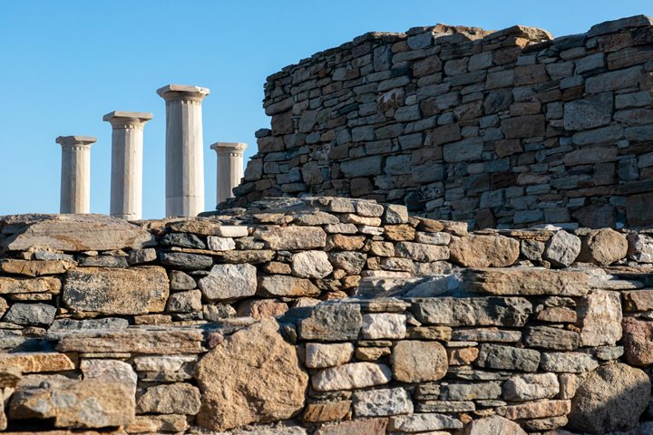 Our first stop today was at the sacred island of Delos, the birthplace of the twin gods Artemis and Apollo. We began our tour in the Hellenistic-era residential district, near the ancient theater. Scattered remains, like an occasional olive press or a fishmonger’s stone table, hint at the thriving commerce that once existed on the island. This commerce resulted in wealthy merchants, whose private residences—some of the best preserved in the ancient world—were decorated with stunning mosaics and frescoed walls. We then proceeded to the Archaic-era sacred precinct, which included the fragments of the colossal kouros, meaning “sculpture of a youth”, dedicated by the Naxians. Although we could easily have spent all day exploring this fascinating archaeological island, increasing winds meant we had to return to ship before lunch. We spent a relaxing afternoon aboard Sea Cloud with photo instructor José Calvo providing an engaging discussion on photographic composition. His tips proved quite useful at our next stop, the vibrant island of Naxos. This island, unlike the other rather barren islands of the Cyclades, is famed for its agriculture, with wheat, barley, and potatoes growing on the island’s fertile plains. We walked through the Venetian Kastro (meaning “castle”) which was the capital of the Duchy of the Archipelago after the Fourth Crusade. Eleni and Kriton guided us through narrow, winding alleys, with periodic gateways surmounted by the marble coats of arms belonging to the Latin nobility. Thanks to centuries of Latin rule, Catholic churches can still be found on Naxos. After our tour some of us walked to the 6th-century B.C. marble gateway that is now the symbol of Naxos, and enjoyed another spectacular Aegean sunset.