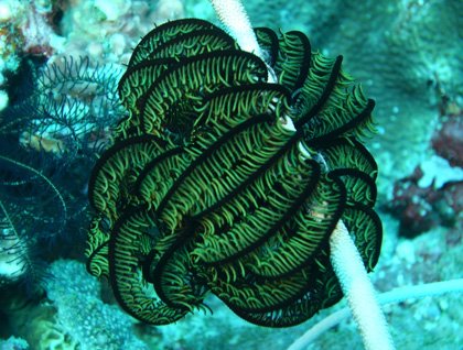 After breakfast everyone goes their preferred way:  snorkeling, glass-bottom boating, and diving. I go diving and it is beautiful: lots of color, lots of fish, lots of fun. Being as this place can have a strong current, there are many current feeders about like feather stars, strange relatives of sea stars, and sea urchins know as crinoids to fossil collectors.