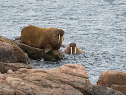Zodiac cruisers explored the shores of Philpots Island and were rewarded with the sight of walrus both in and out of the water. On land hikers found a treasure trove of arctic plants and evidence of muskox in the form of scat and fur. Hiking up and over from the landing we got a great visual on the walrus and learned about the adjacent North Water Polynya that has helped to sustain both animals and people for eons bygone. The largest polynya in the Arctic, this is an opening in the ice created by winds and tides that creates somewhat of an arctic oasis for seals, walrus, bowheads, narwhal, and belugas to feed in the winter. Named “North Water” by 19th century whalers who relied on it for spring passage, it was a popular area not only for the whalers seeking the bounty of the bowhead but the native Dorset, Thule, and Inuit who have lived in this part of the Eastern Arctic. Dr. E.P Philpots and the crew of the whaling ship Queen spent the winter of 1865 in Queen’s Harbor seeking such cetaceans and the promise of blubber and baleen.
