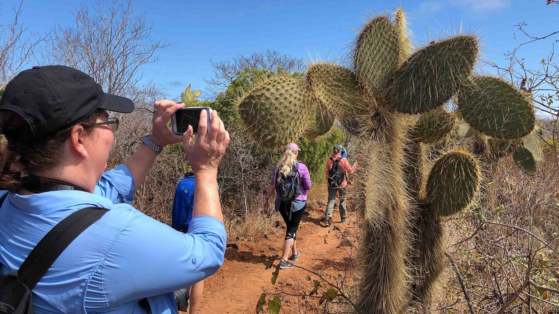 After visiting southern Santa Cruz and the highlands yesterday, this morning began with sunny skies and a hike on the north side of Santa Cruz. We arrived to step onto black lava rocks and then observed the lush green vegetation and a brackish pond with a Galapagos marine iguana basking in the sun pond side. But today, we were in search of a species we hadn’t seen yet – the Galapagos land iguana. We had to leave the breezy oceanside environment and traverse to the dry habitat of this terrestrial species. The land iguanas were hard to spot among the dry grasses and volcanic ash, but we were eventually able to glimpse their bright yellow markings and spotted several of them. We also had to be careful not to disturb their underground burrows.