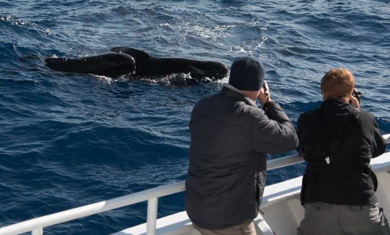 With the afternoon upon us, the sea state calmed and sun broke through the low cloud. The Bridge team spotted a pod of long fin pilot whales. We rushed to the bow with cameras and telephoto lens. The pilot whales had other ideas, soon they entire pod including some calves were riding out bow wake. Telephoto lens gave way to wide angles and iPhones.